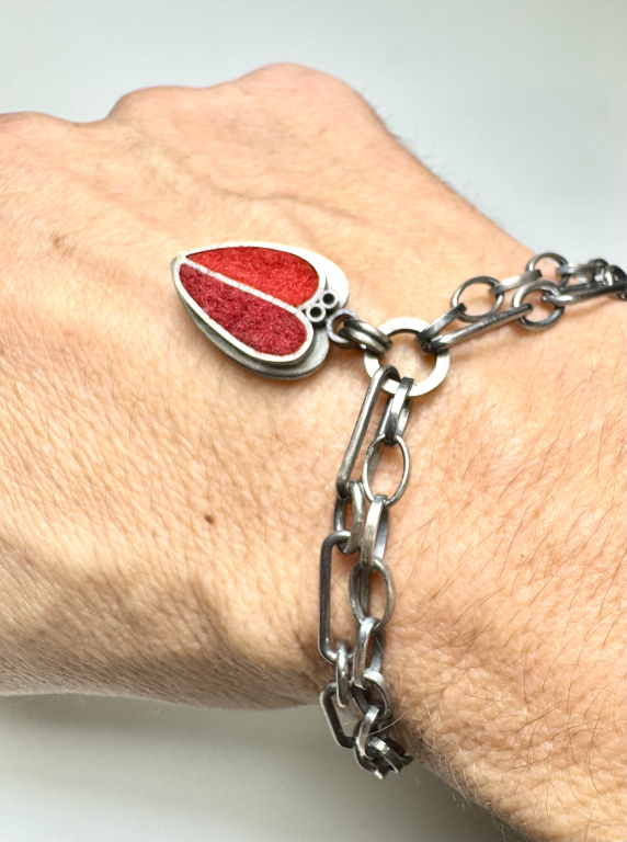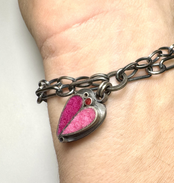 Oxidized sterling silver Heart/Leaf Charm Bracelet in Hot Palette. The charm element is double sided with two similar but different designs, in two different colors. Oxidized sterling bracelet is comprised of different chains to create visual interest and texture. Bracelet measures approximately 7 1/8"long, with the Heart/Leaf Charm measuring approximately 7/8"h 1/2"w x 1/4"d.