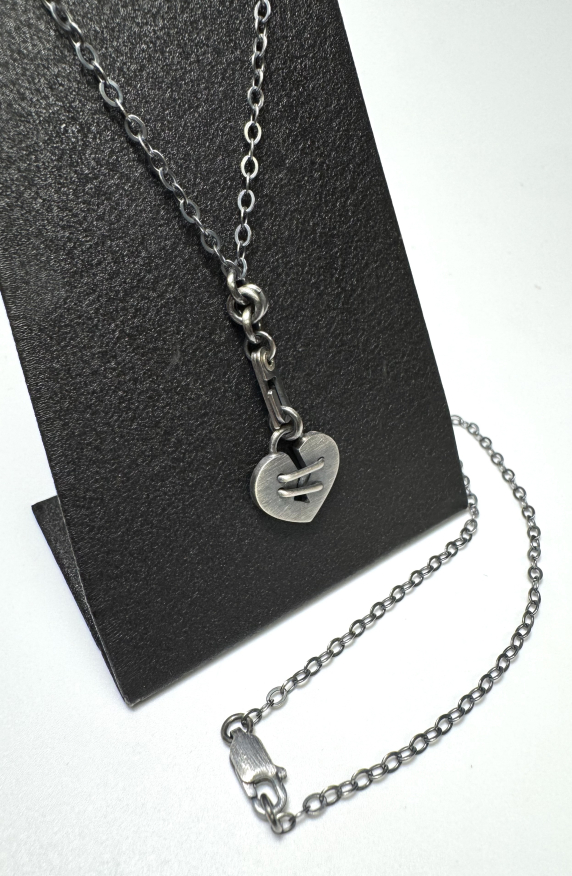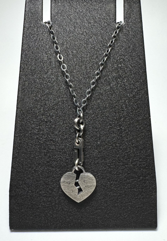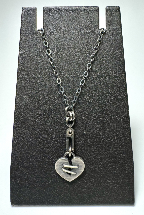 Fabricated oxidized sterlinf silver necklace. Mended heart is handging on a Sister Clasp. Necklace measures approximately 18" long. Dangling portion with heart and other elements measures approximately 1 3/8"h x 1/2" x 1/8"d.