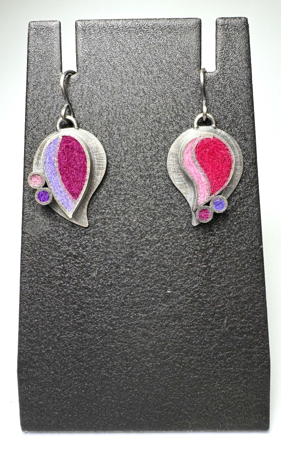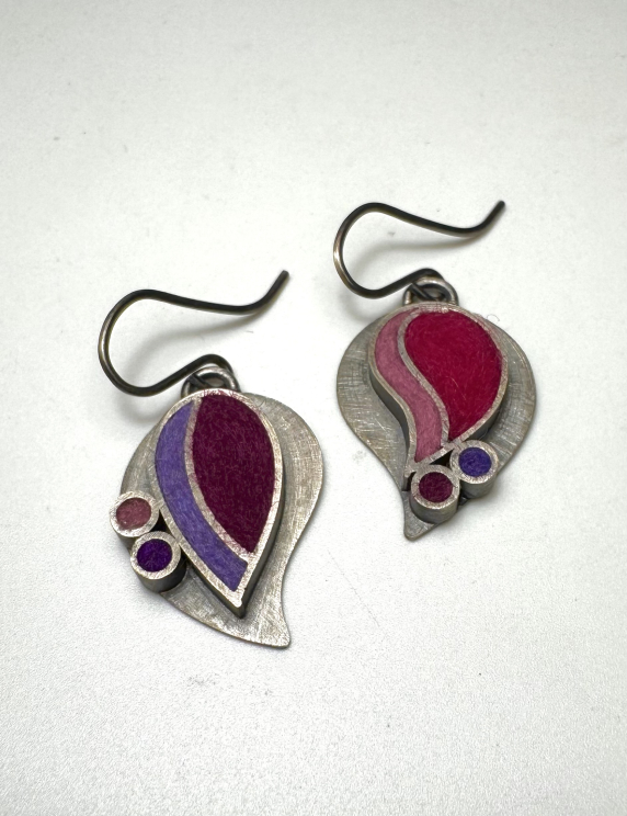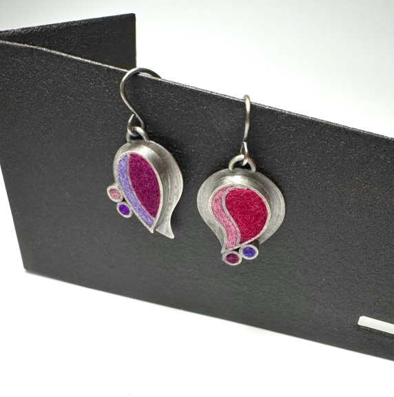 Fabricated oxidized sterling earrings set with wool felt in Hot Palette. Colors include cranberry, persimmon, raspberry and fuchsia. Ear wires are sterling.