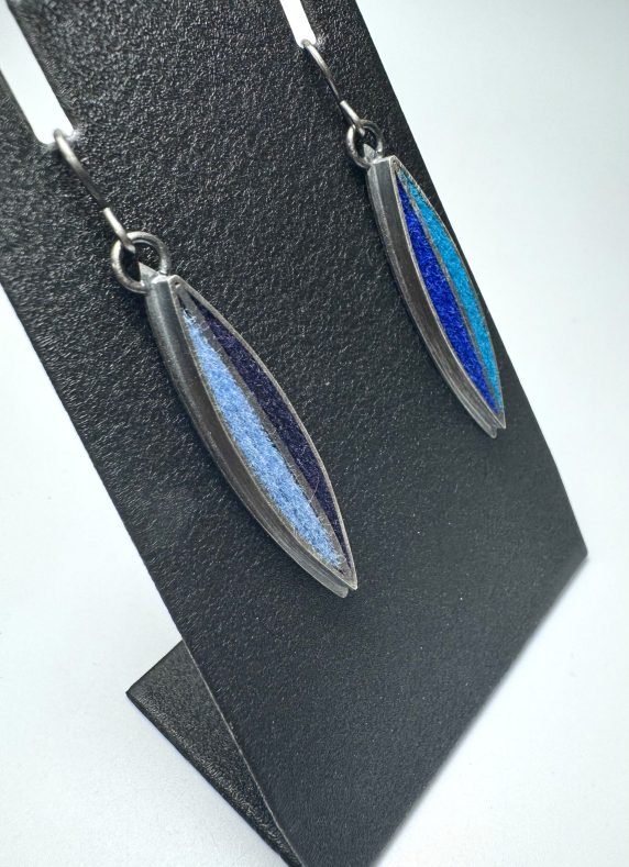 Fabricated oxidized sterling silver leaf earrings set with wool felt. Beautiful and always flattering, leaves. Color distribution is asymmetrical in a Blues Palette in sky/blueberry and blue/turquoise. Earrings measure from the top of the ear wire 2 1/16"h x 1/4"w x 1/8"d.