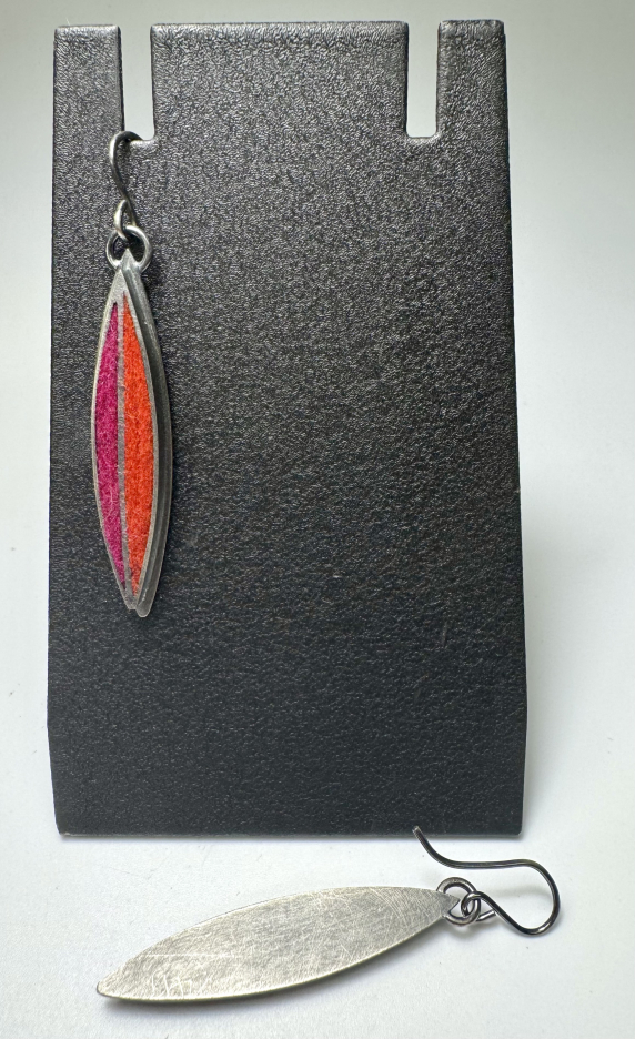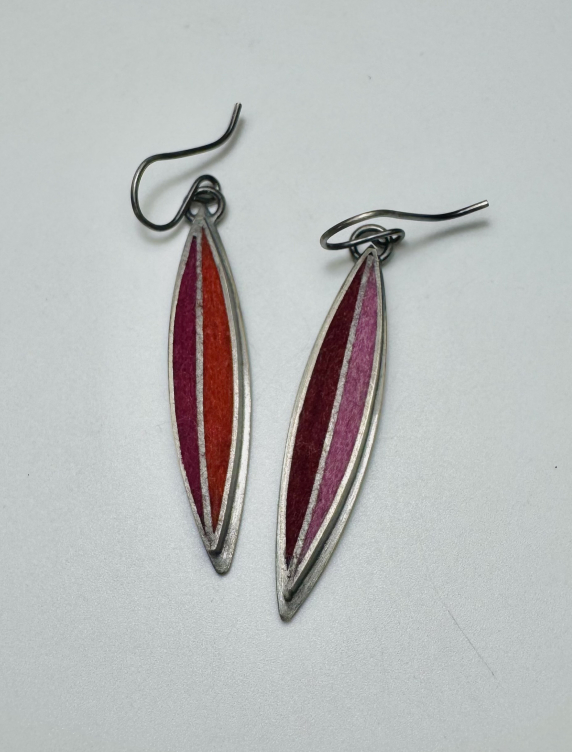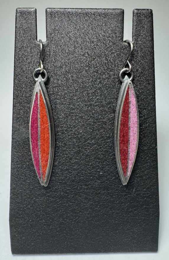 Fabricated oxidized sterling silver leaf earrings set with wool felt. Beautiful and always flattering, leaves. Color distribution is asymmetrical in a Hot Palette in fuchsia/persimmon and cranberry/rose. Earrings measure from the top of the ear wire 2 1/16"h x 1/4"w x 1/8"d.
