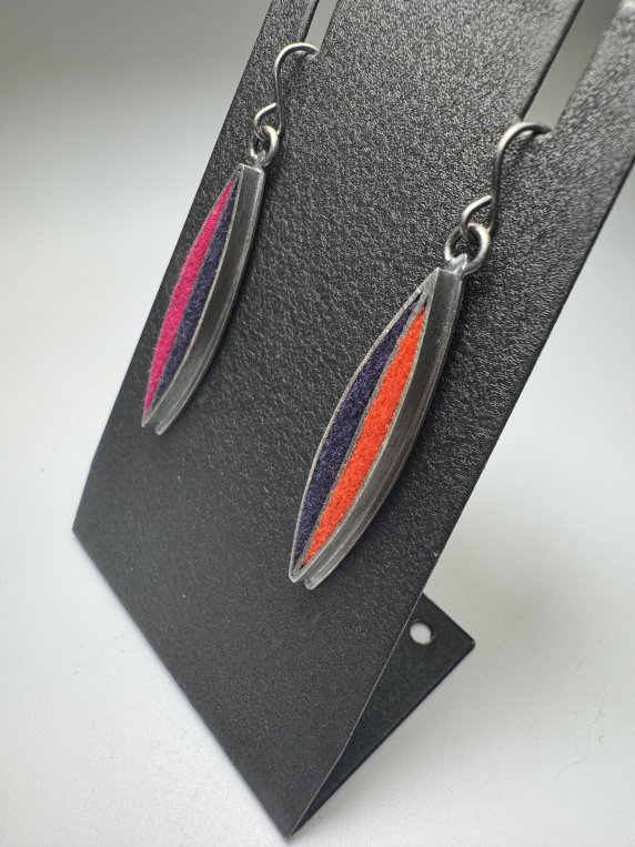Fabricated oxidized sterling silver leaf earrings set with wool felt. Beautiful and always flattering, leaves. Color distribution is asymmetrical in a Multicolor 1 Palette in blueberry/fuchsia/persimmon. Earrings measure from the top of the ear wire 2 1/16"h x 1/4"w x 1/8"d.