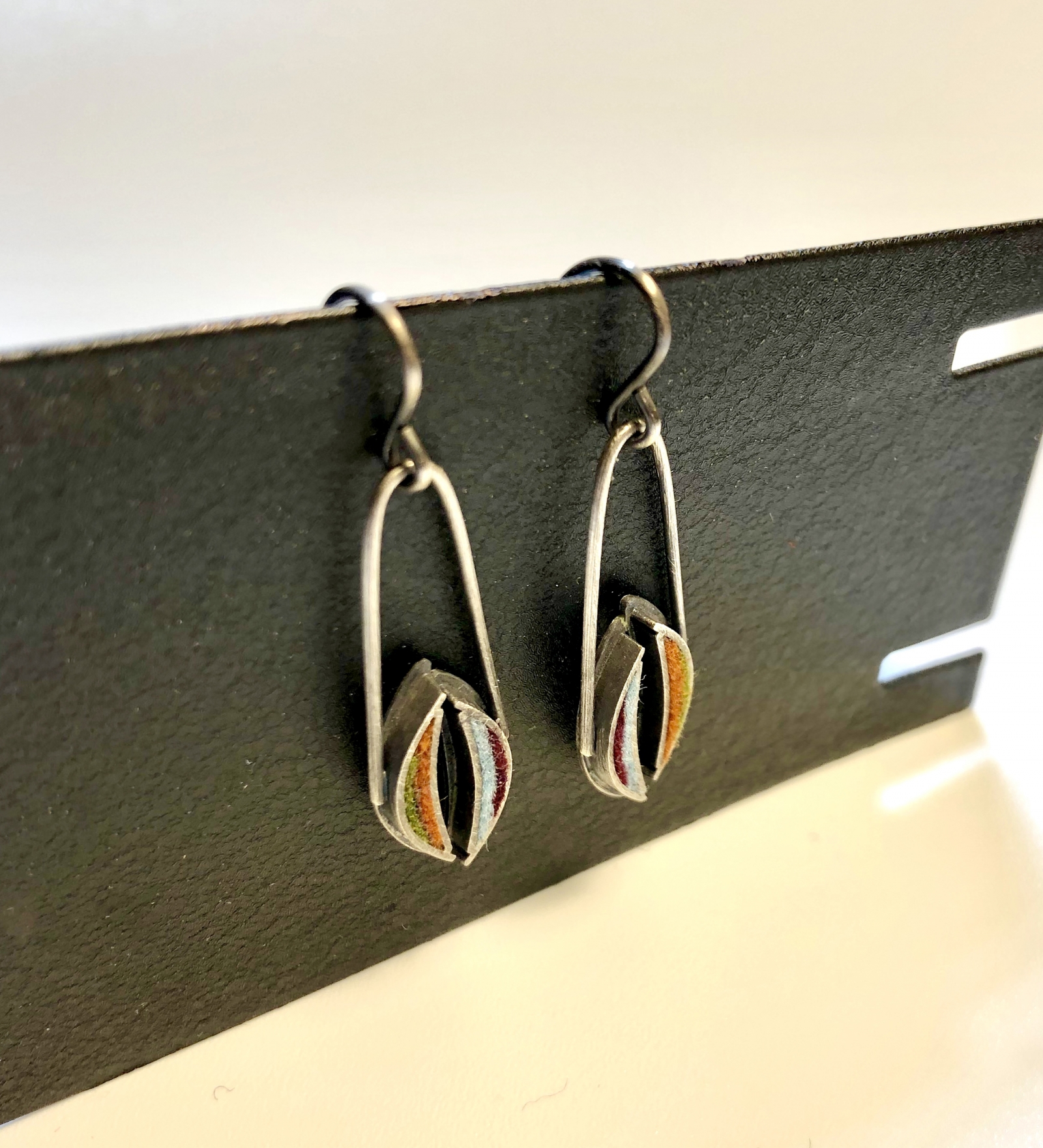 Fabricated oxidized sterlng silver earrings set with wool felt in an Earth Tone Palette. Super cute with a hint of color and an emphasis on the metalwork. Colors are olive/cinnamon and ice/wine.