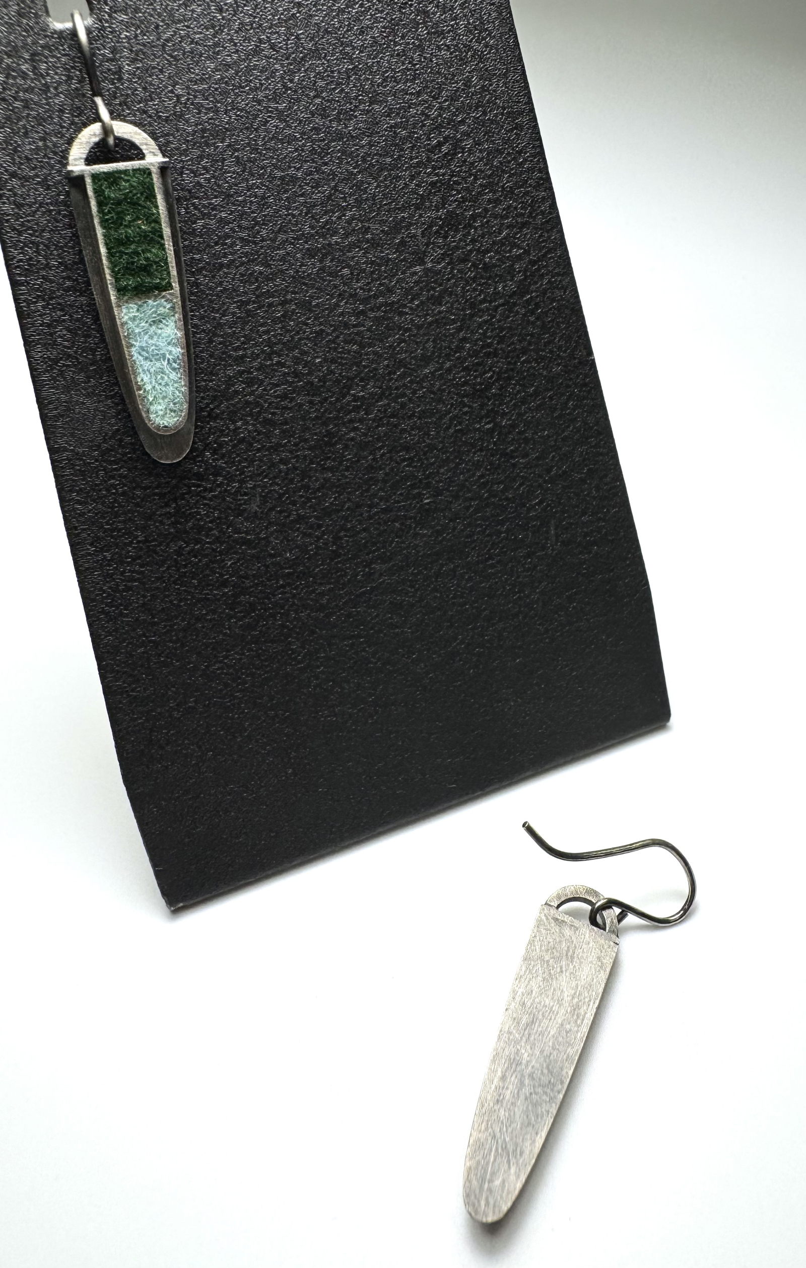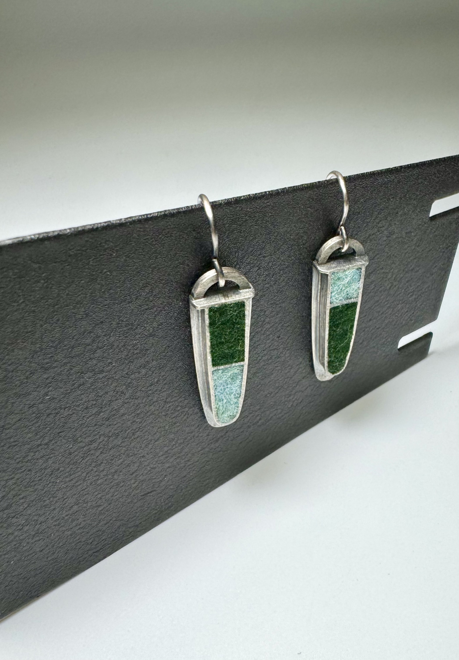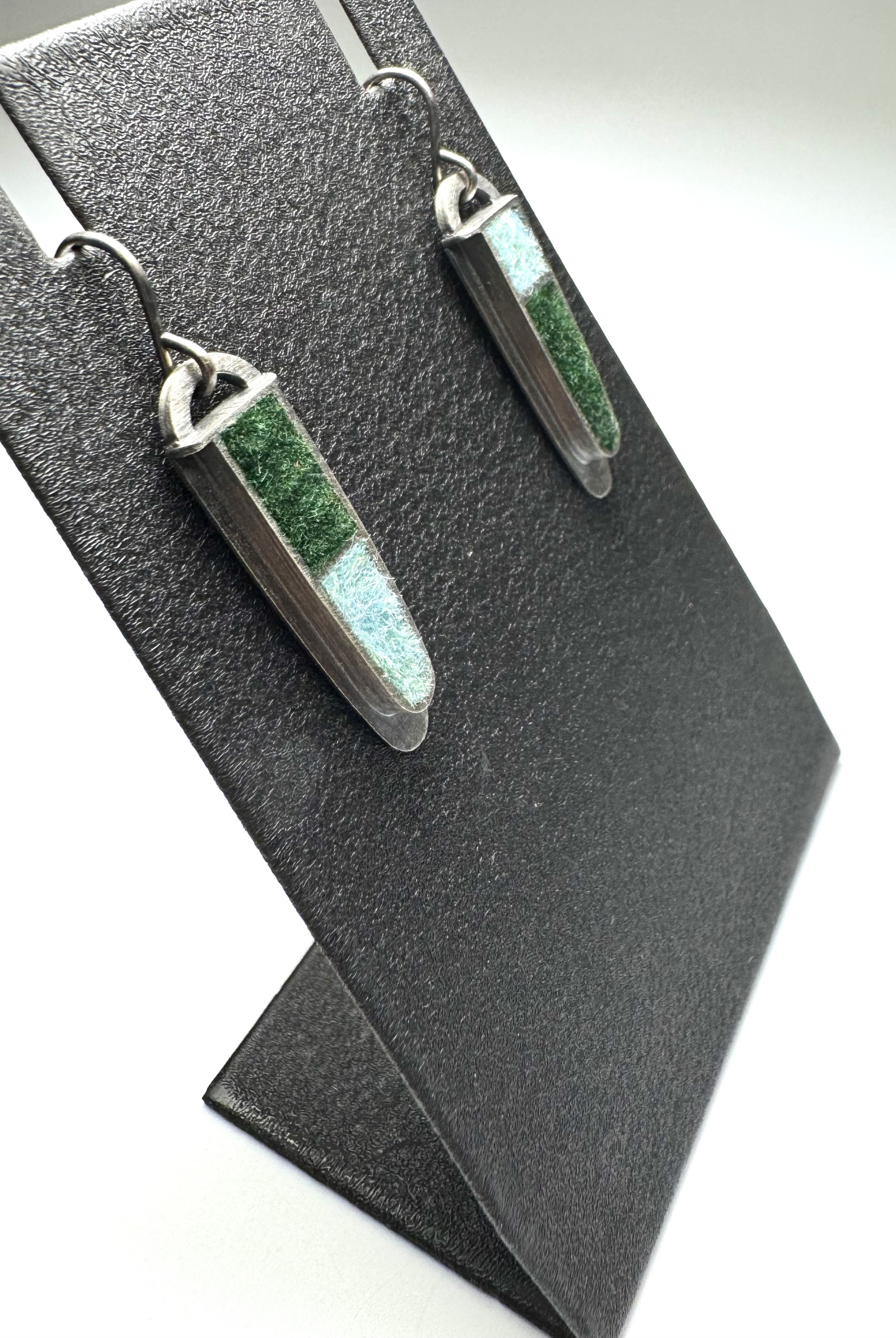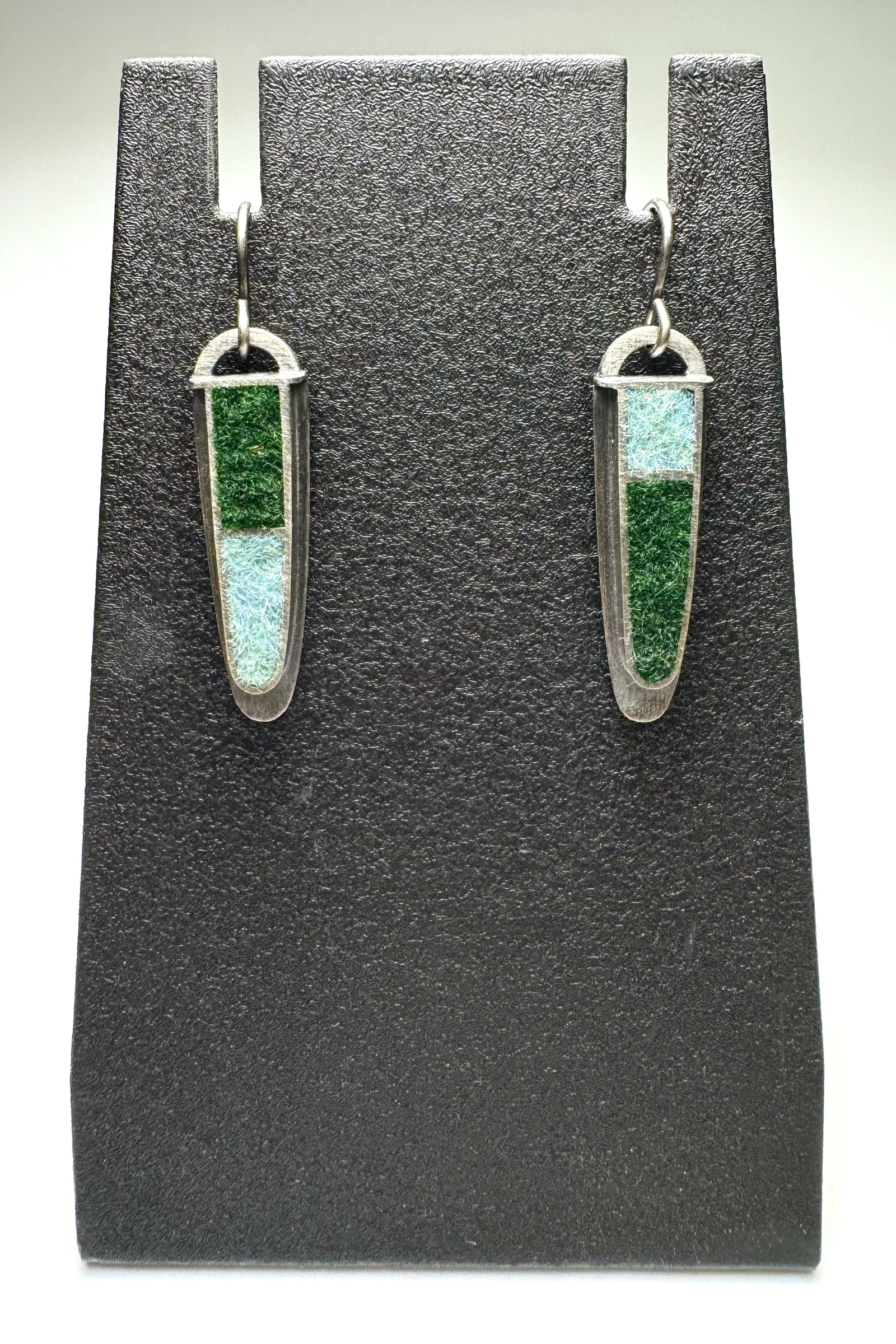 Fabricated oxidized sterling silver earrings in Blue/Green involving forest green and icy blue hues! Easy shape to wear. Good movement. Earrings measure from the top of the ear wire approximately 11/2" h x 3/8" w x 1/8" d.