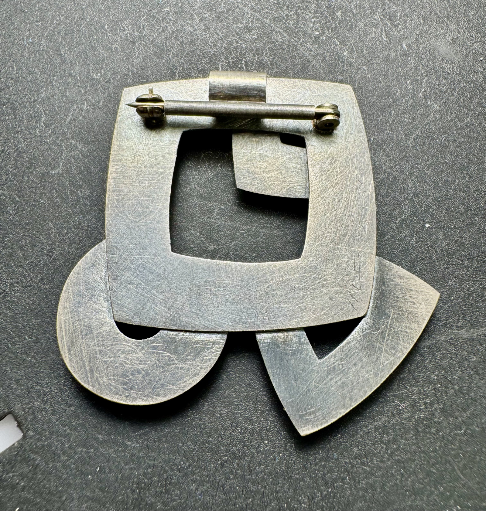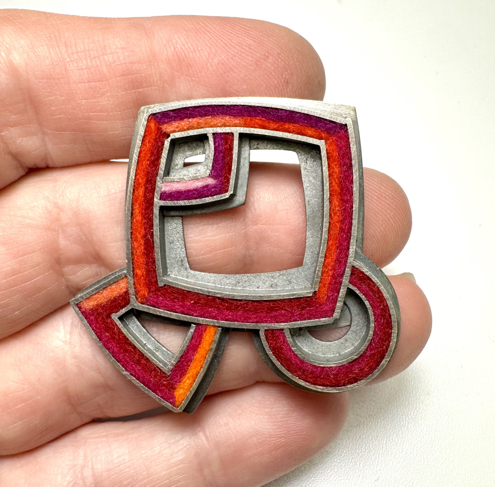 Fabricated oxidized sterling silver pendant and brooch set with wool felt in a Hot Palette. I love deconstructing and reconstructing these pieces. No two are exactly the same. Fun to wear as either a brooch or a pendant. This piece measure approximately 1 1/2" h x 1 5/8" w x 1/8" d. Pendant converter is included, custom fit to and slips right off the pin stem.