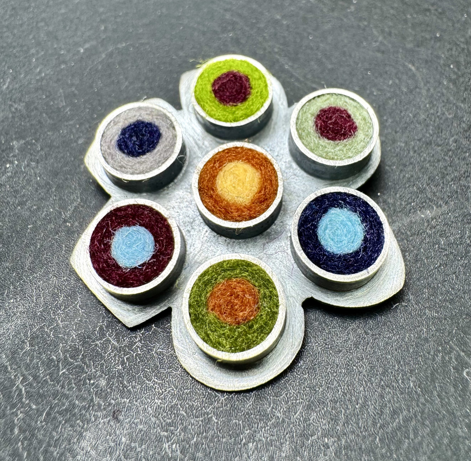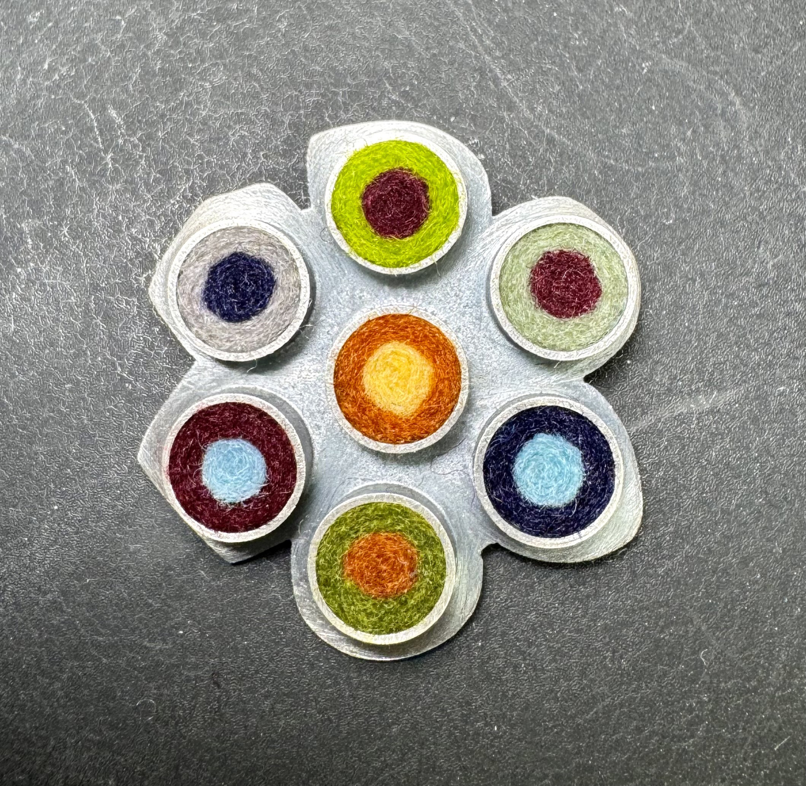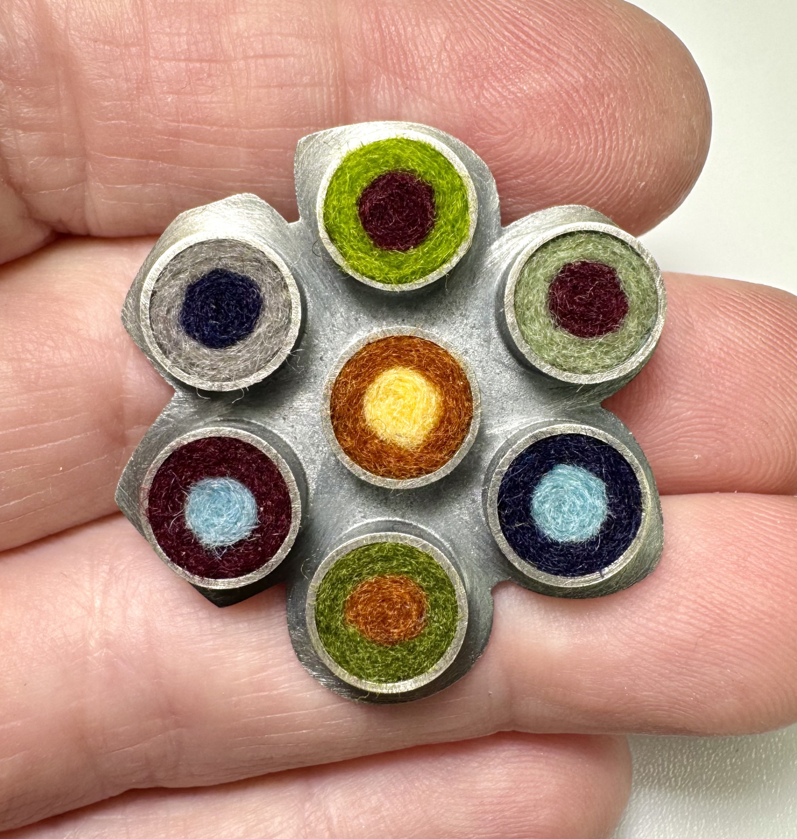 Oxidized sterling silver pendant and brooch set with wool felt. One of my first designs. Mod, himsical, versatile and fun. Earth tone palette. Measures approximately; 1 1/4" diam x 1/4"d.
