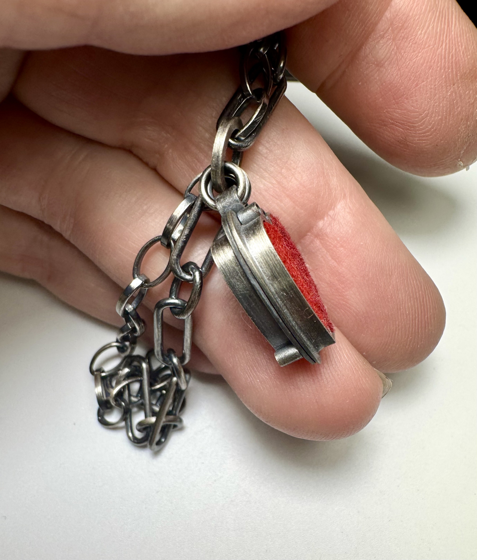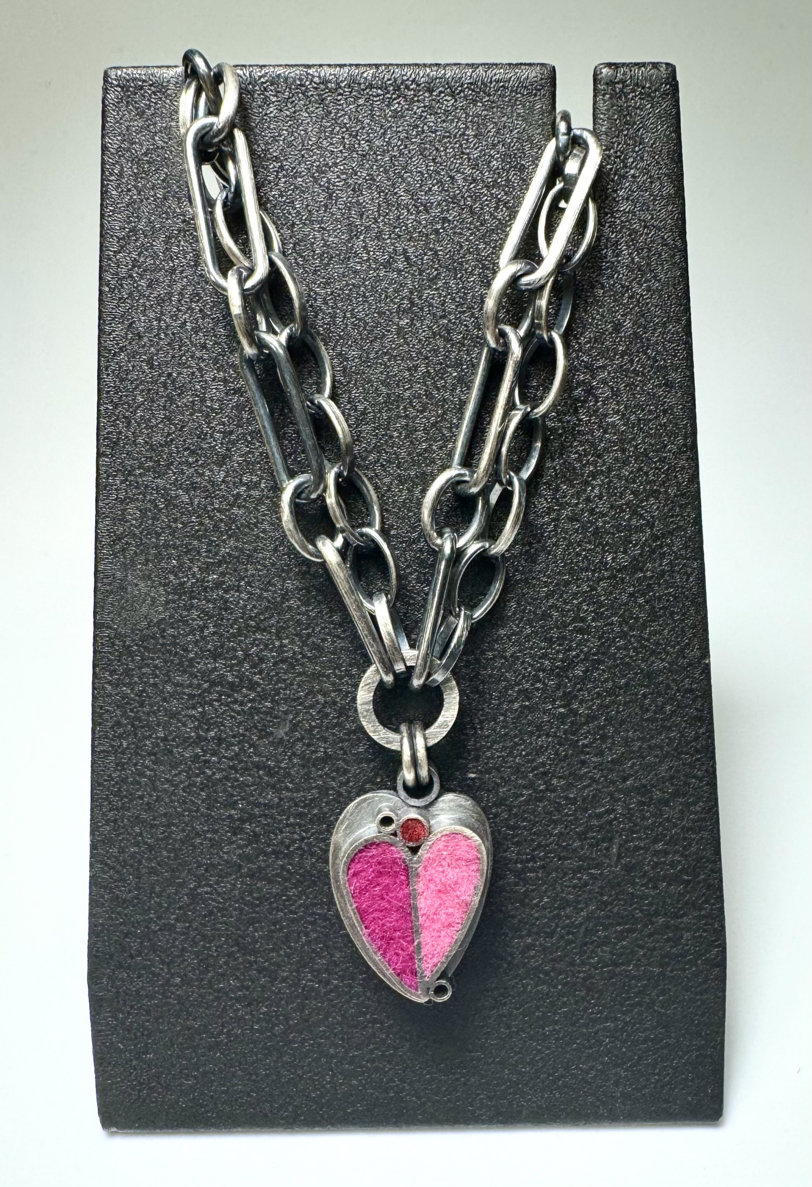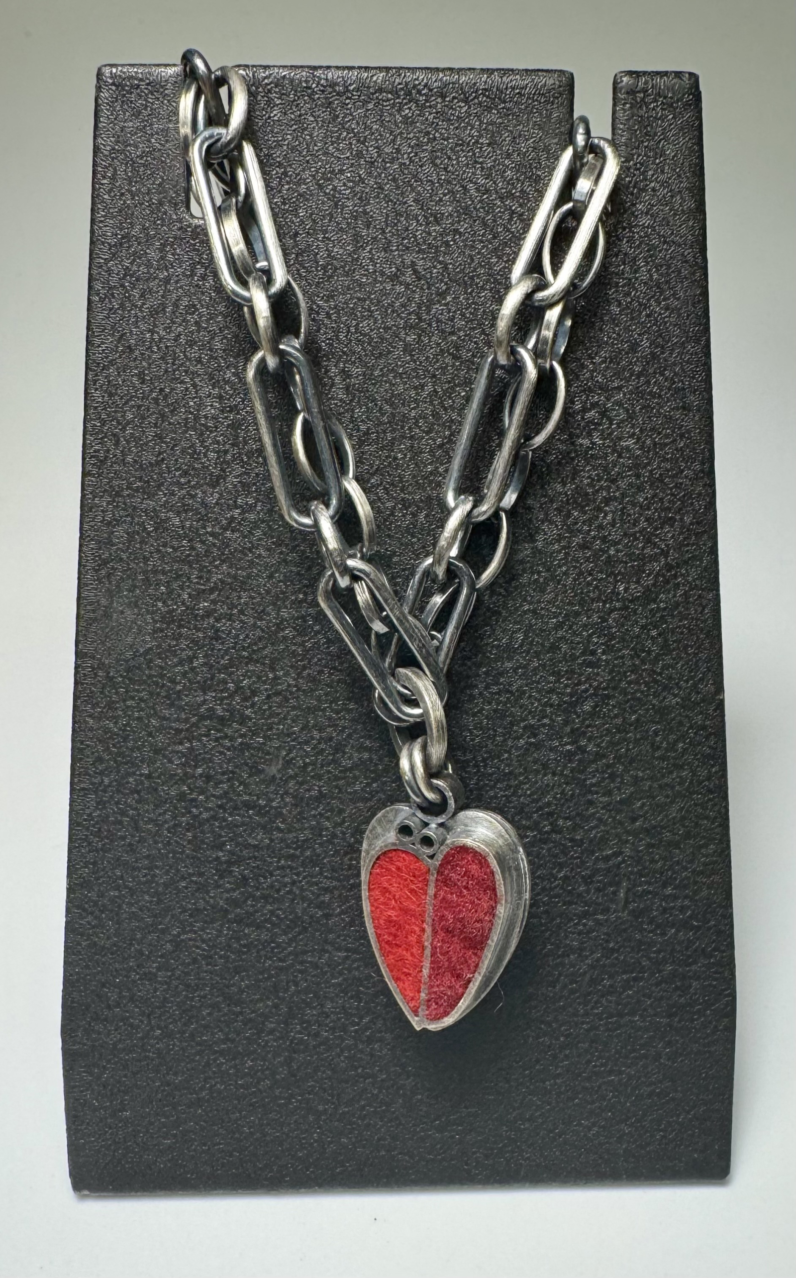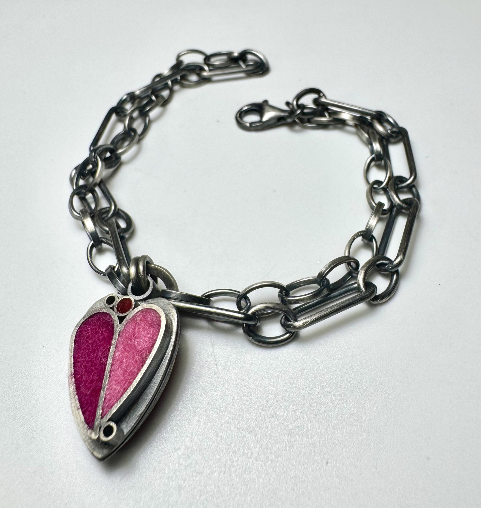 Oxidized sterling silver Heart/Leaf Charm Bracelet in Hot Palette. The charm element is double sided with two similar but different designs, in two different colors. Oxidized sterling bracelet is comprised of different chains to create visual interest and texture. Bracelet measures approximately 7 1/8"long, with the Heart/Leaf Charm measuring approximately 7/8"h 1/2"w x 1/4"d.