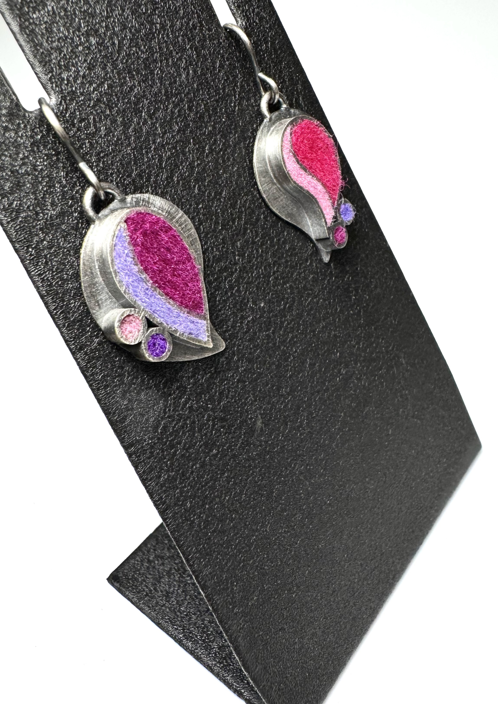 Fabricated oxidized sterling earrings set with wool felt in Hot Palette. Colors include cranberry, persimmon, raspberry and fuchsia. Ear wires are sterling.