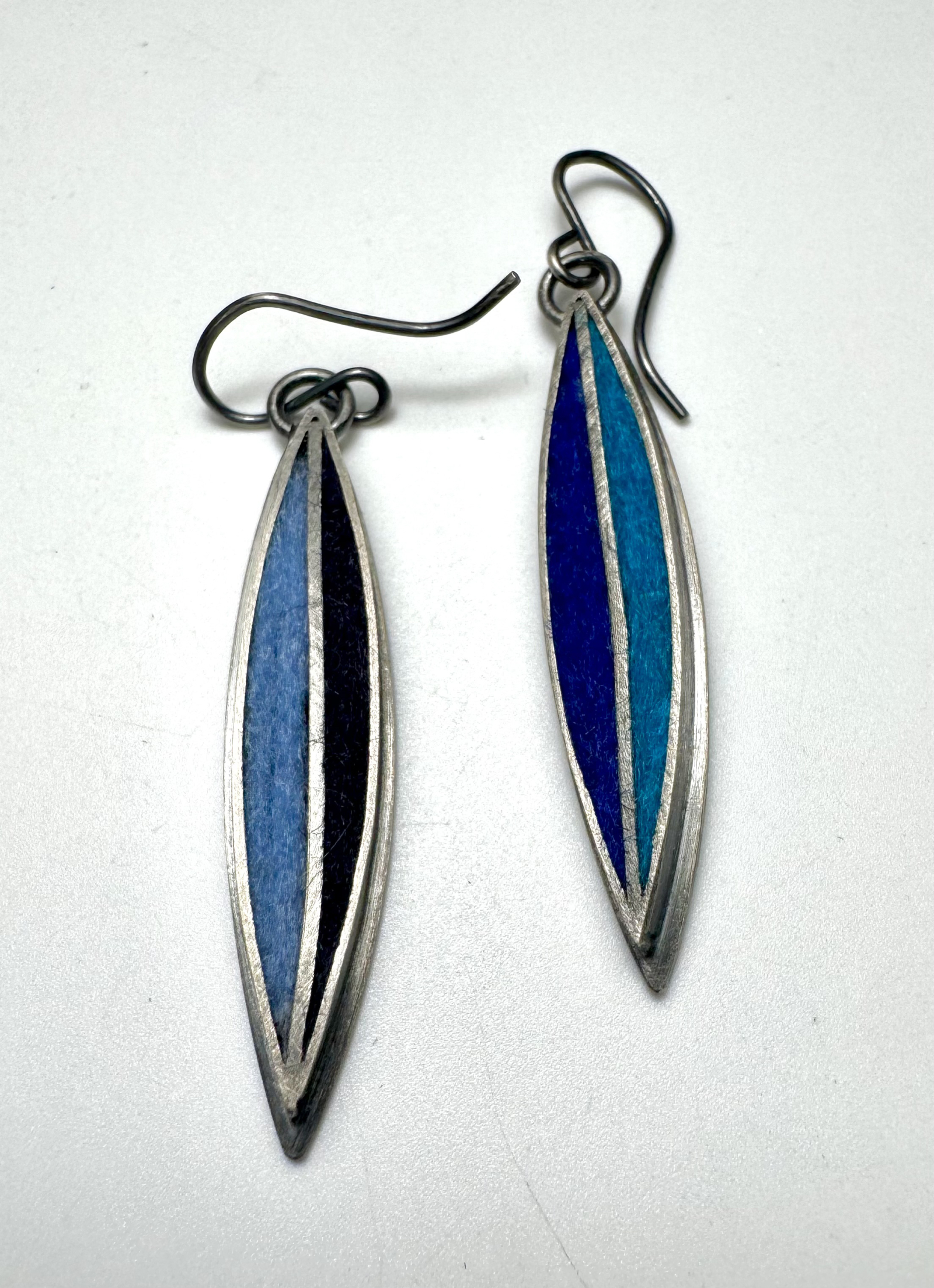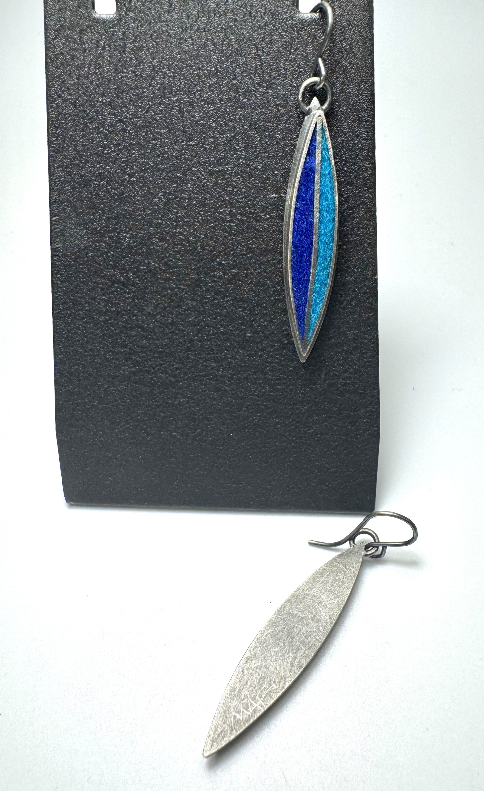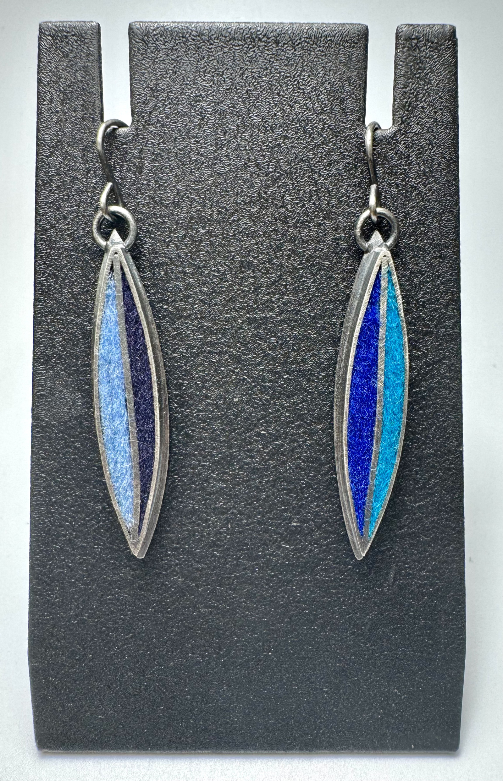 Fabricated oxidized sterling silver leaf earrings set with wool felt. Beautiful and always flattering, leaves. Color distribution is asymmetrical in a Blues Palette in sky/blueberry and blue/turquoise. Earrings measure from the top of the ear wire 2 1/16"h x 1/4"w x 1/8"d.