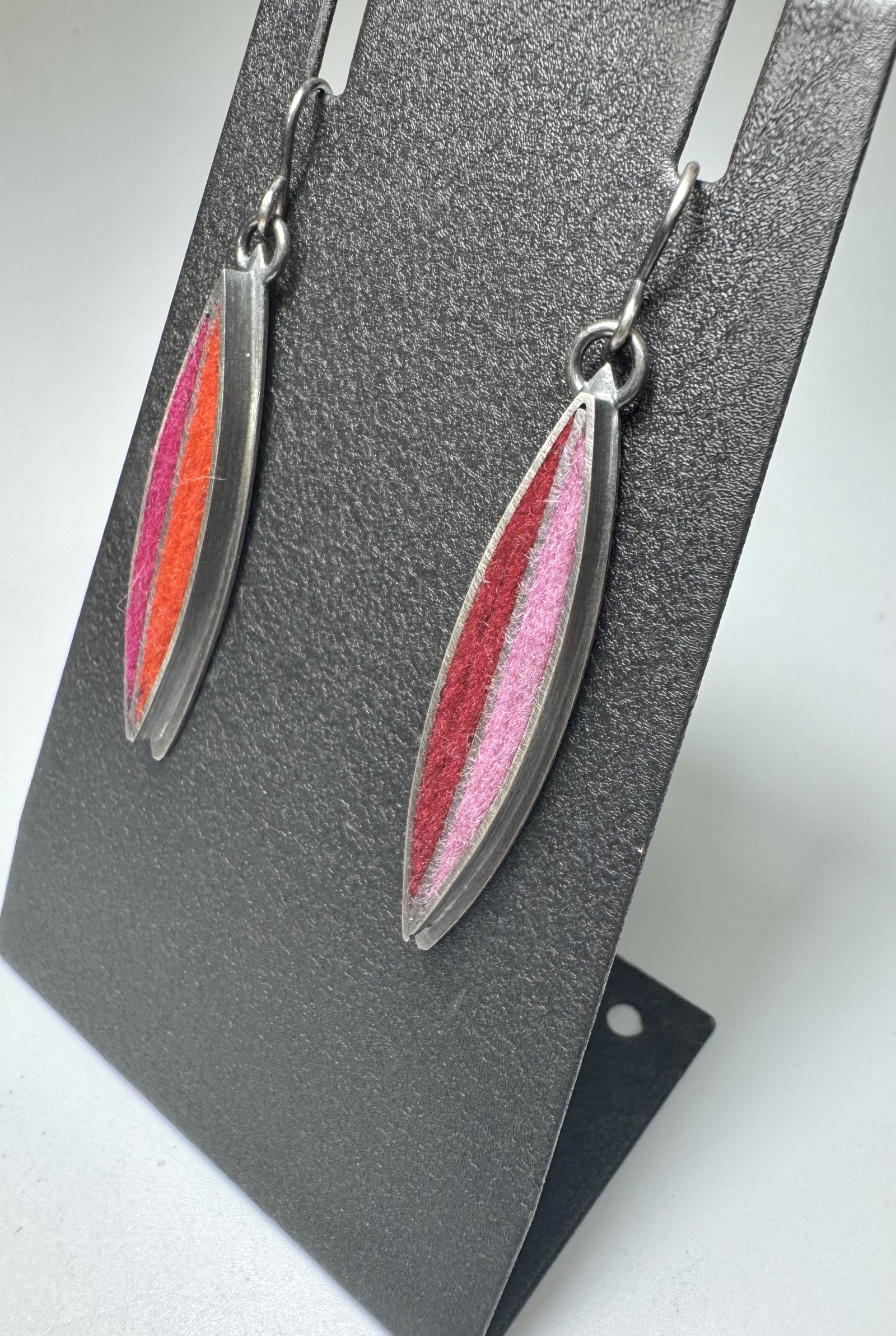 Fabricated oxidized sterling silver leaf earrings set with wool felt. Beautiful and always flattering, leaves. Color distribution is asymmetrical in a Hot Palette in fuchsia/persimmon and cranberry/rose. Earrings measure from the top of the ear wire 2 1/16"h x 1/4"w x 1/8"d.