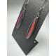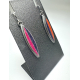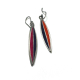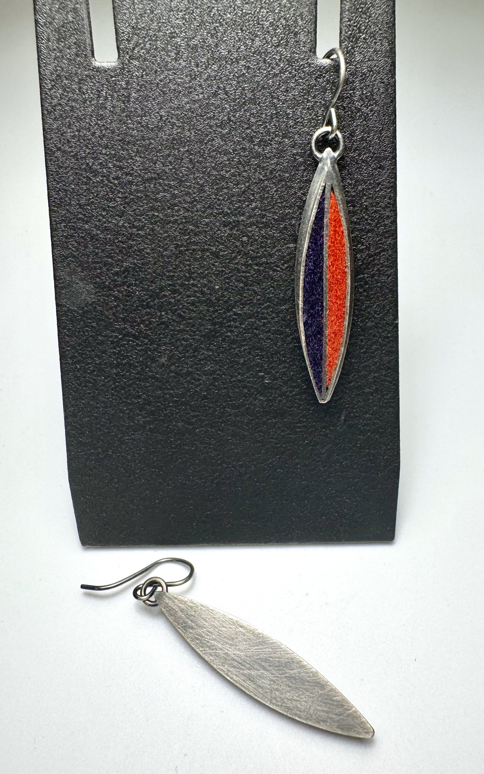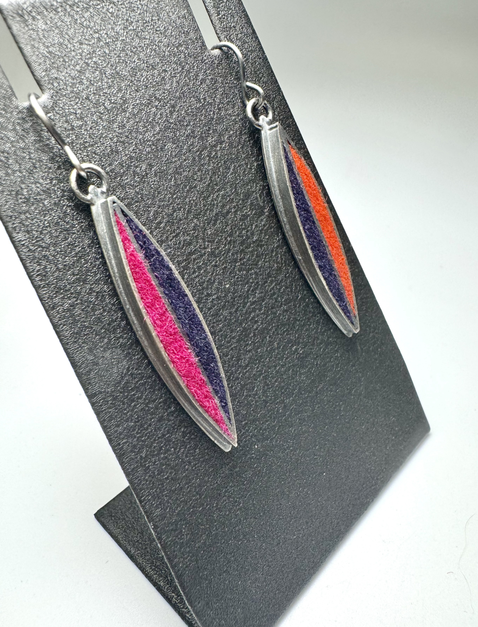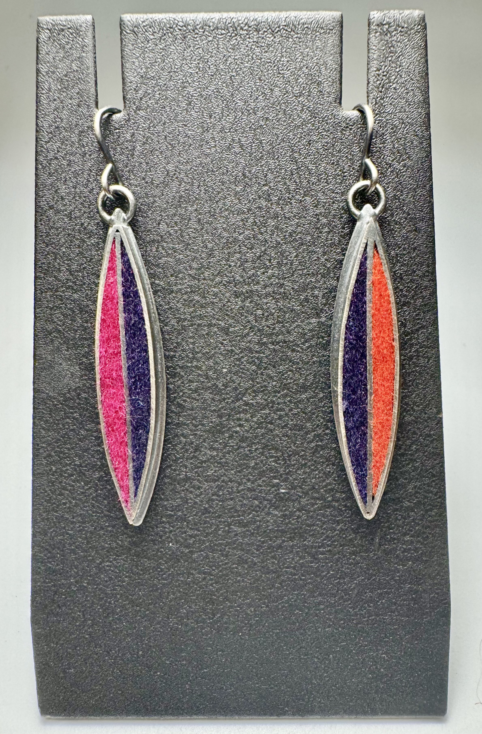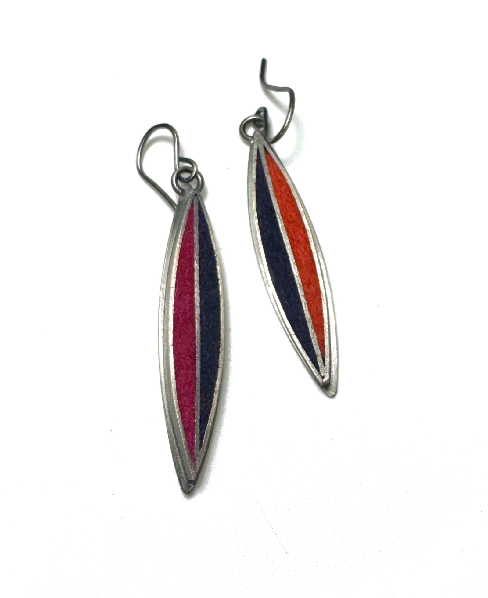 Fabricated oxidized sterling silver leaf earrings set with wool felt. Beautiful and always flattering, leaves. Color distribution is asymmetrical in a Multicolor 1 Palette in blueberry/fuchsia/persimmon. Earrings measure from the top of the ear wire 2 1/16"h x 1/4"w x 1/8"d.