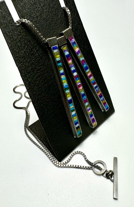 Oxidized sterling necklace set with wool felt. The three pendants are strung on a 24" box chain with fabricated toggle clasp. 1 Blue/Green pendant and 2 Cool.